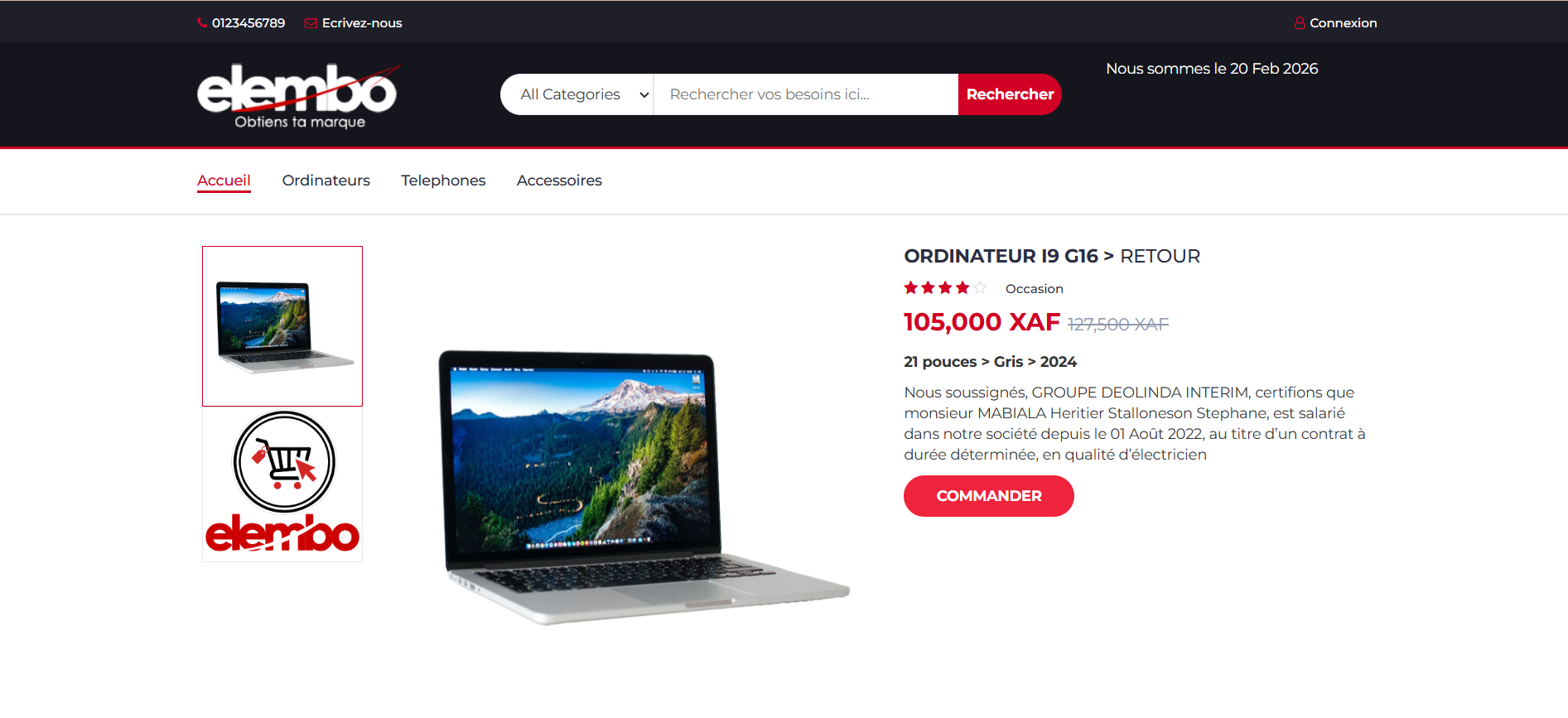 Accéder à la plateforme avec l'adresse suivante, www.elembo.cg et voyer cet interface, qui propose plusieurs gammes des produits et les coûts de solde.