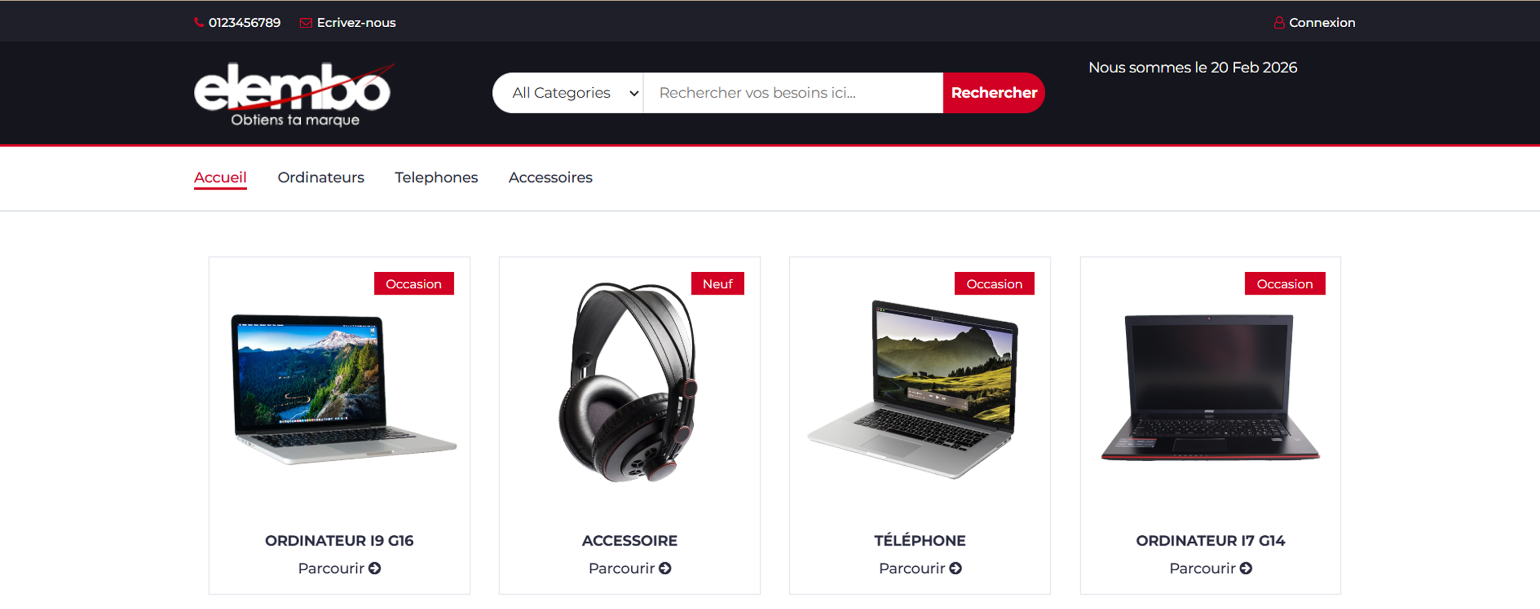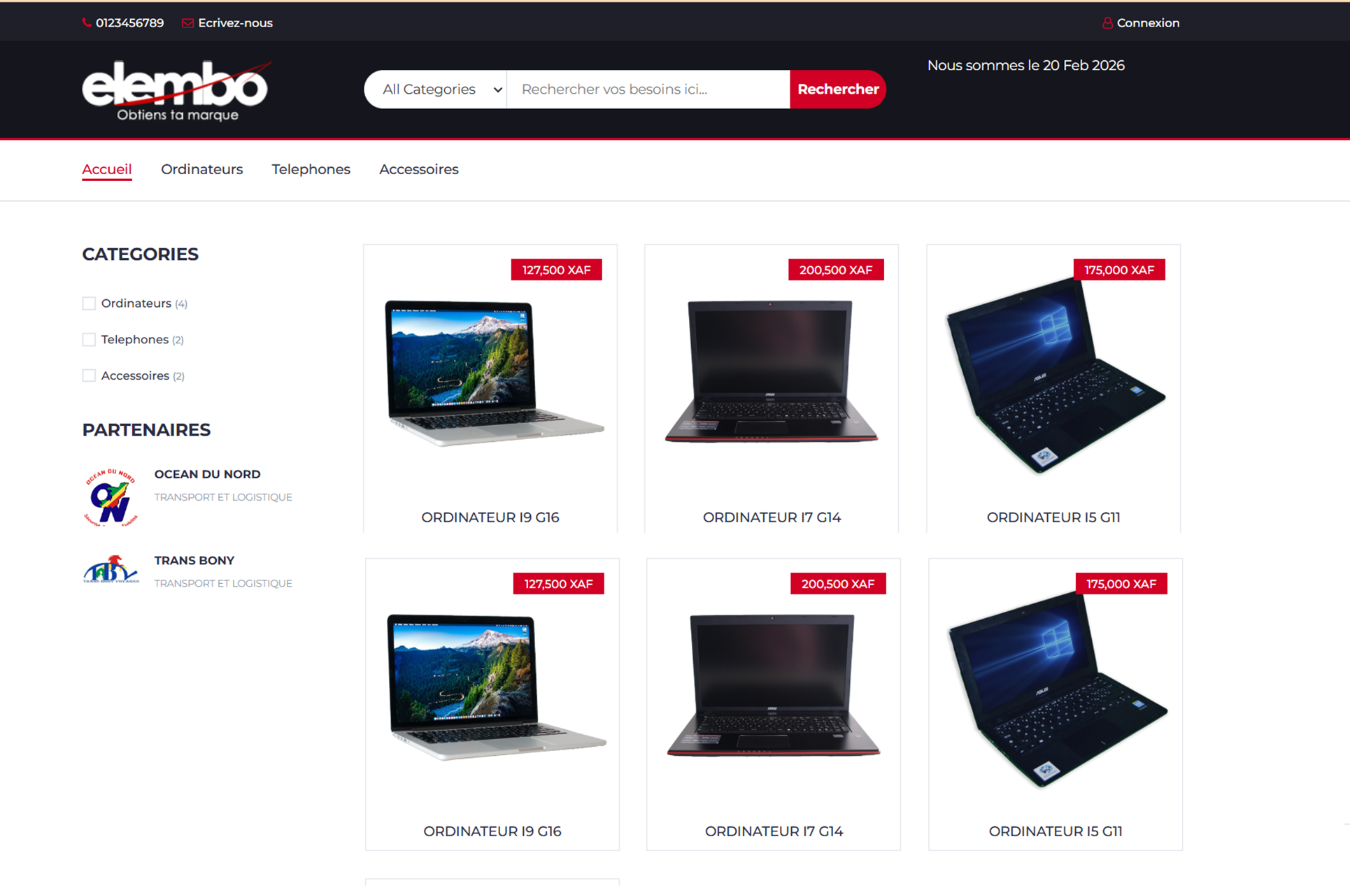 Accéder à la plateforme avec l'adresse suivante, www.elembo.cg et voyer cet interface, qui propose plusieurs gammes des produits et les coûts de solde.
